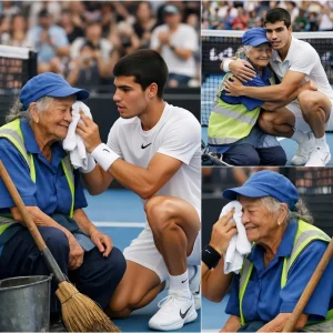 🚨 UNA GRAN SORPRESA EN SEÚL, COREA DEL SUR: Carlos Alcaraz se arrodilló ante una empleada de limpieza del estadio, ¡un momento que hizo llorar a millones de aficionados! Tras entrenar para el Hyundai Card Super Match, Carlos Alcaraz no se apresuró a celebrar ni a volver al vestuario como la mayoría de los jugadores. En cambio, el español de 23 años hizo algo inesperado: fue directo a la zona de la portería, donde una empleada de limpieza mayor, de unos 70 años, recogía silenciosamente los balones derramados. Miles de espectadores en el estadio y millones de espectadores en directo quedaron atónitos cuando Carlos se arrodilló, tomó con delicadeza la mano de la mujer y colocó su toalla limpia sobre la de ella. Dijo solo una frase, solo una, pero cambió por completo la vida de la anciana…