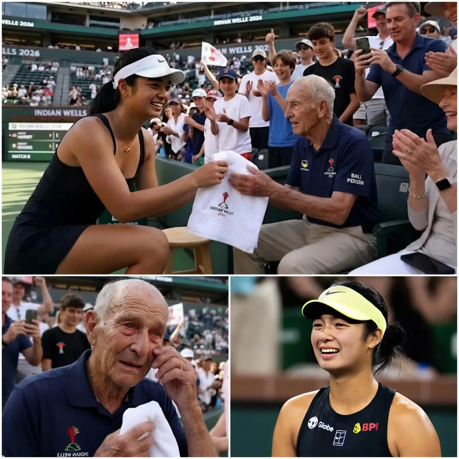 The gesture alone silenced nearby sections of the arena. Eala reached for a fresh towel from her bag, still damp and cool from the match. She placed it gently into his weathered hands, her fingers briefly covering his. The old man’s eyes widened; he seemed unsure how to respond to such unexpected attention from a professional player.