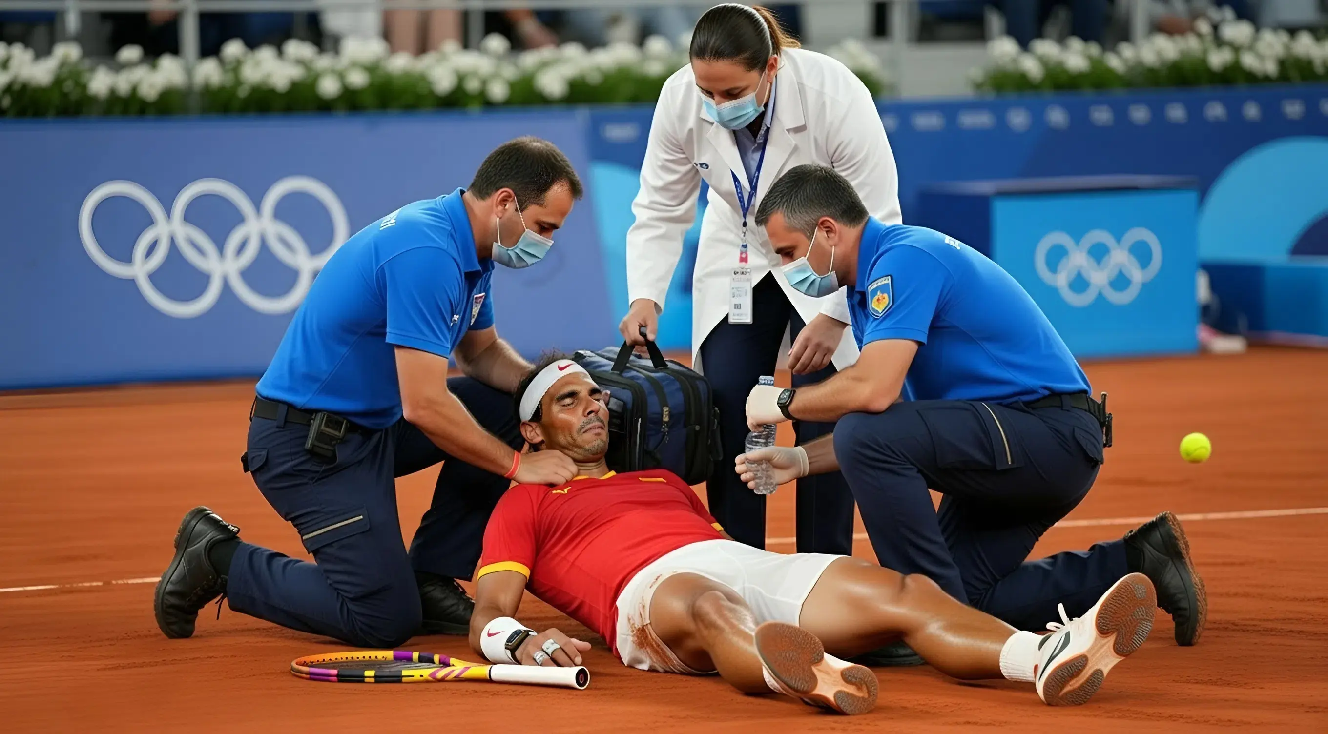 According to fictional reports from event staff, Nadal had been engaging in an intense rally during a friendly exhibition match. A forceful collision near the sideline led to a heavy fall that left the tennis icon visibly in pain, unable to immediately rise.