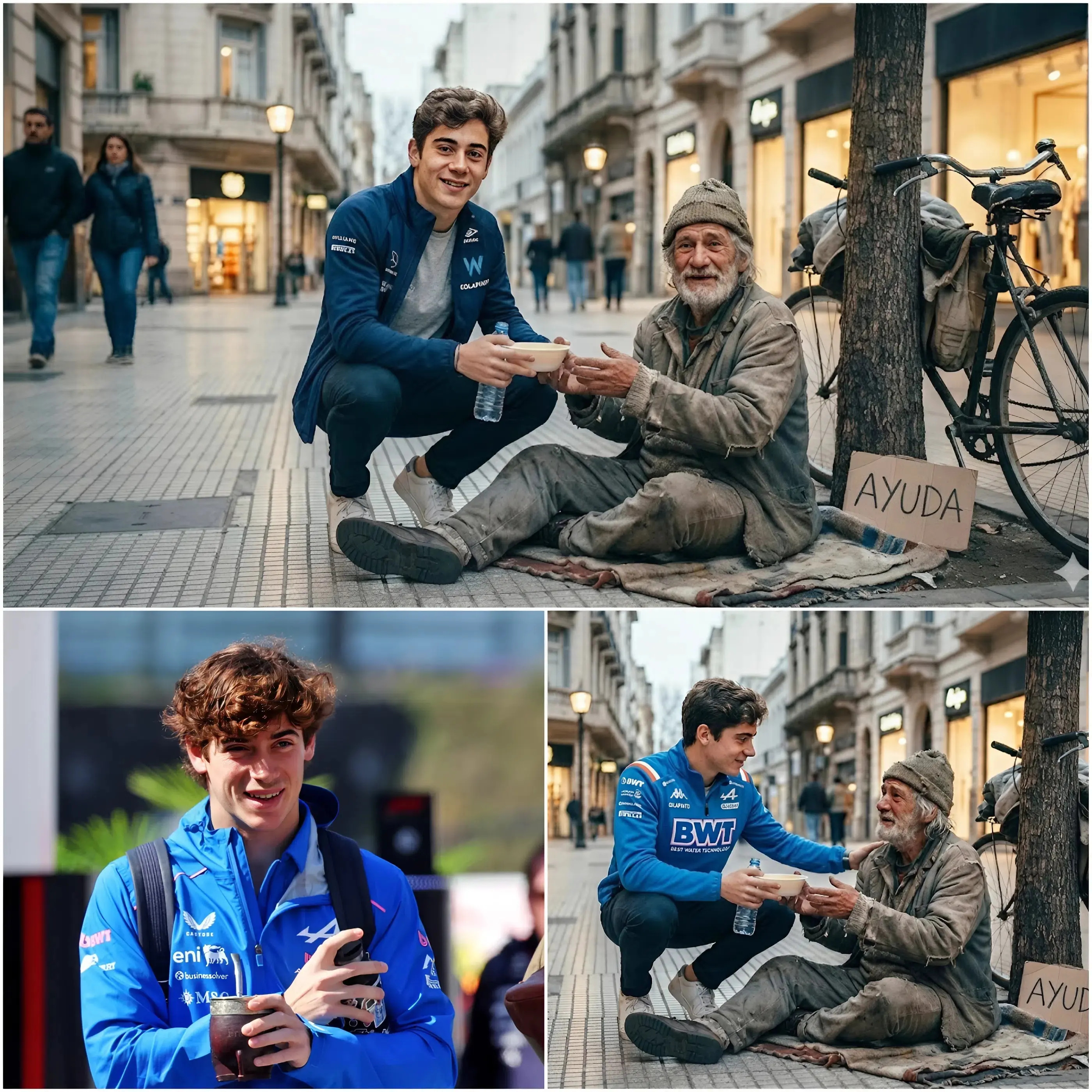🏁 “Déjame ayudarle un poco” – MOMENTO CÁLIDO DESPUÉS DE PASCUA: El joven piloto Franco Colapinto, de camino a casa tras un día lleno de emociones en la pista, al pasar por calles tranquilas aún bañadas por la luz del atardecer, no dudó en detenerse en medio de la calle para ayudar a un hombre sin hogar que estaba encogido al borde del camino, ofreciéndole un gesto cálido y un momento humano único, que conmovió profundamente a todos los presentes.