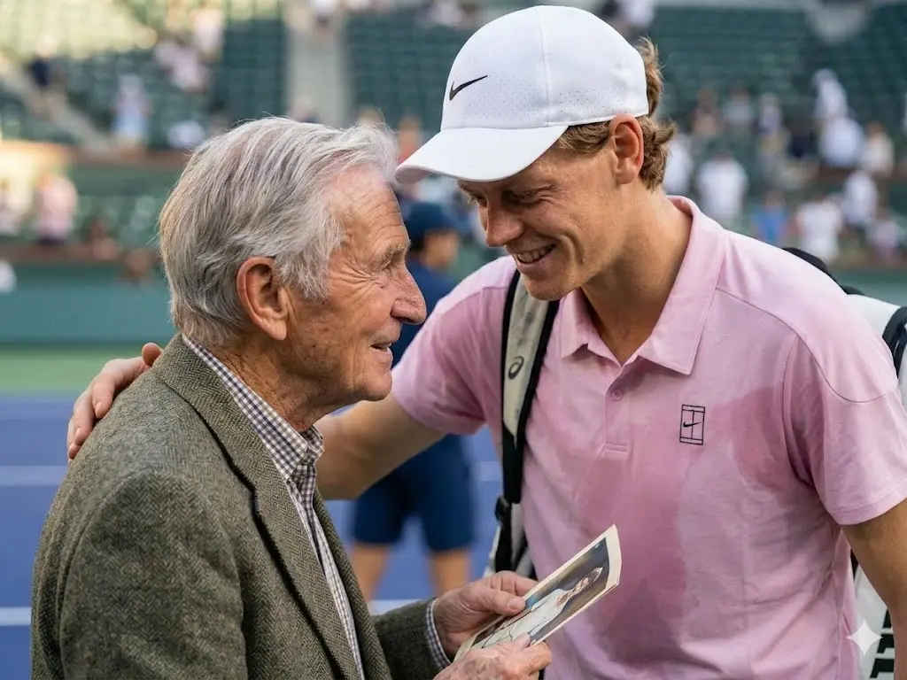 Mentre i fotografi cercavano di catturare le immagini della vittoria, Sinner non si diresse verso la sua panchina. Camminò lentamente verso il bordo del campo, in una zona che solitamente rimane fuori dall’attenzione delle telecamere. Lì, vicino alla rete laterale, si trovava un uomo anziano incaricato di preparare le palline e gli asciugamani per la partita successiva. Era uno dei ball boy più anziani mai visti in quel torneo, un volontario che da anni collaborava con l’organizzazione e che quella sera stava svolgendo il suo lavoro con la discrezione di sempre.
