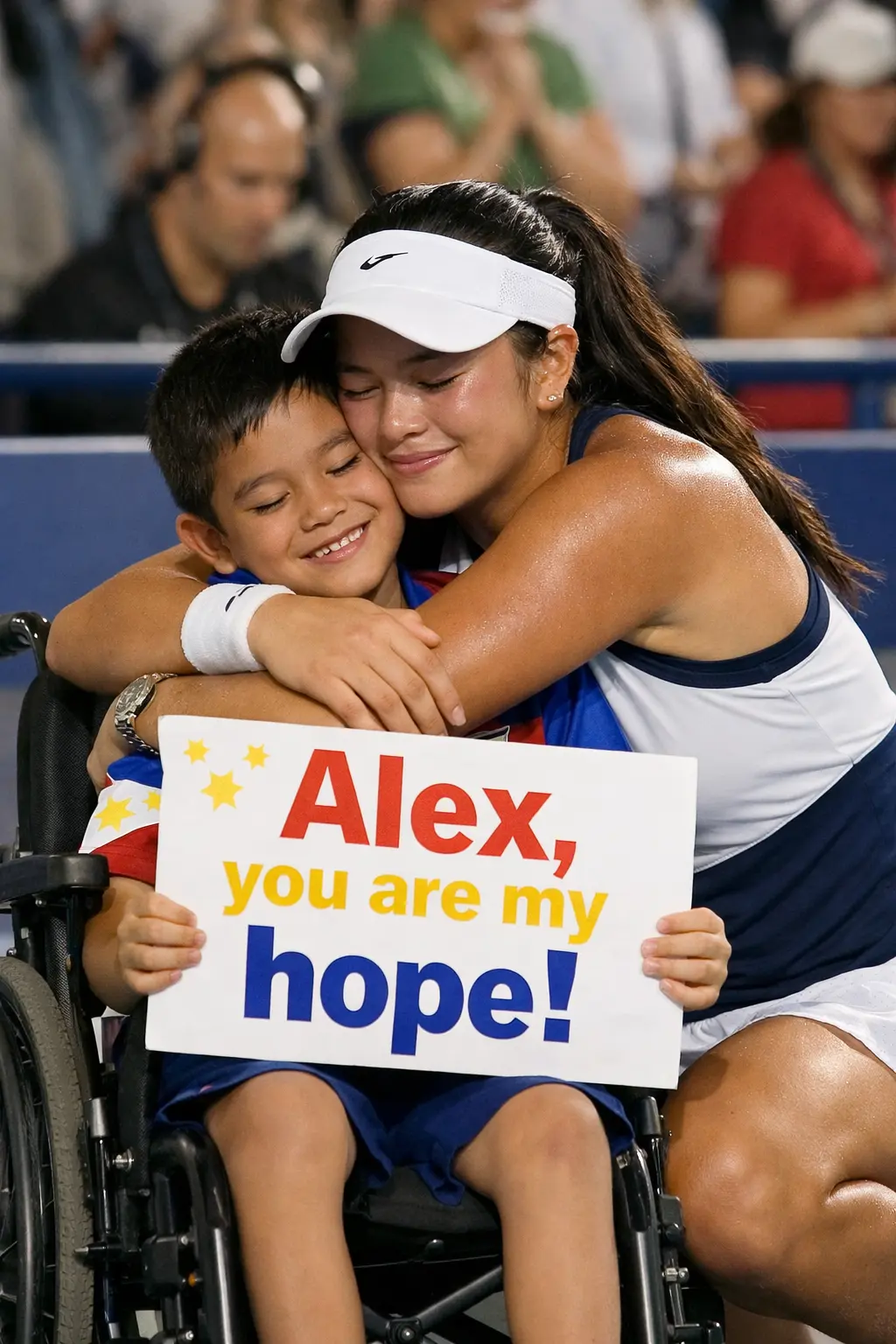 What happened next stunned everyone. Alex Eala dropped her racquet, jogged quickly to the sideline, and climbed into the front row area. There, in a wheelchair, sat a 10-year-old Filipino boy wearing a Philippines shirt and clutching a handmade sign that read, “Alex, you are my hope!”