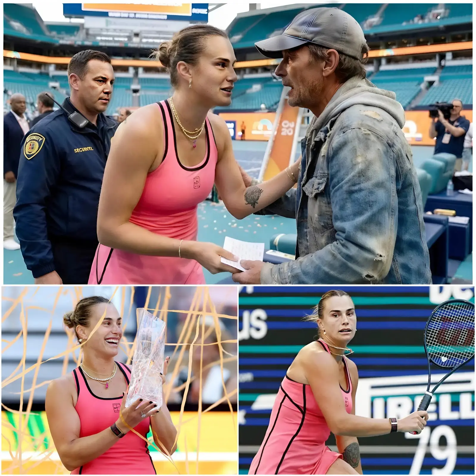 💖🎾El personal de seguridad estaba a punto de detenerlo, pero Aryna Sabalenka negó con la cabeza y dijo: “Déjenlo acercarse.” Un hombre con zapatillas desgastadas y una gorra descolorida intentaba desesperadamente entregar un papel escrito a mano a Aryna tras la final del Miami Open 2026.