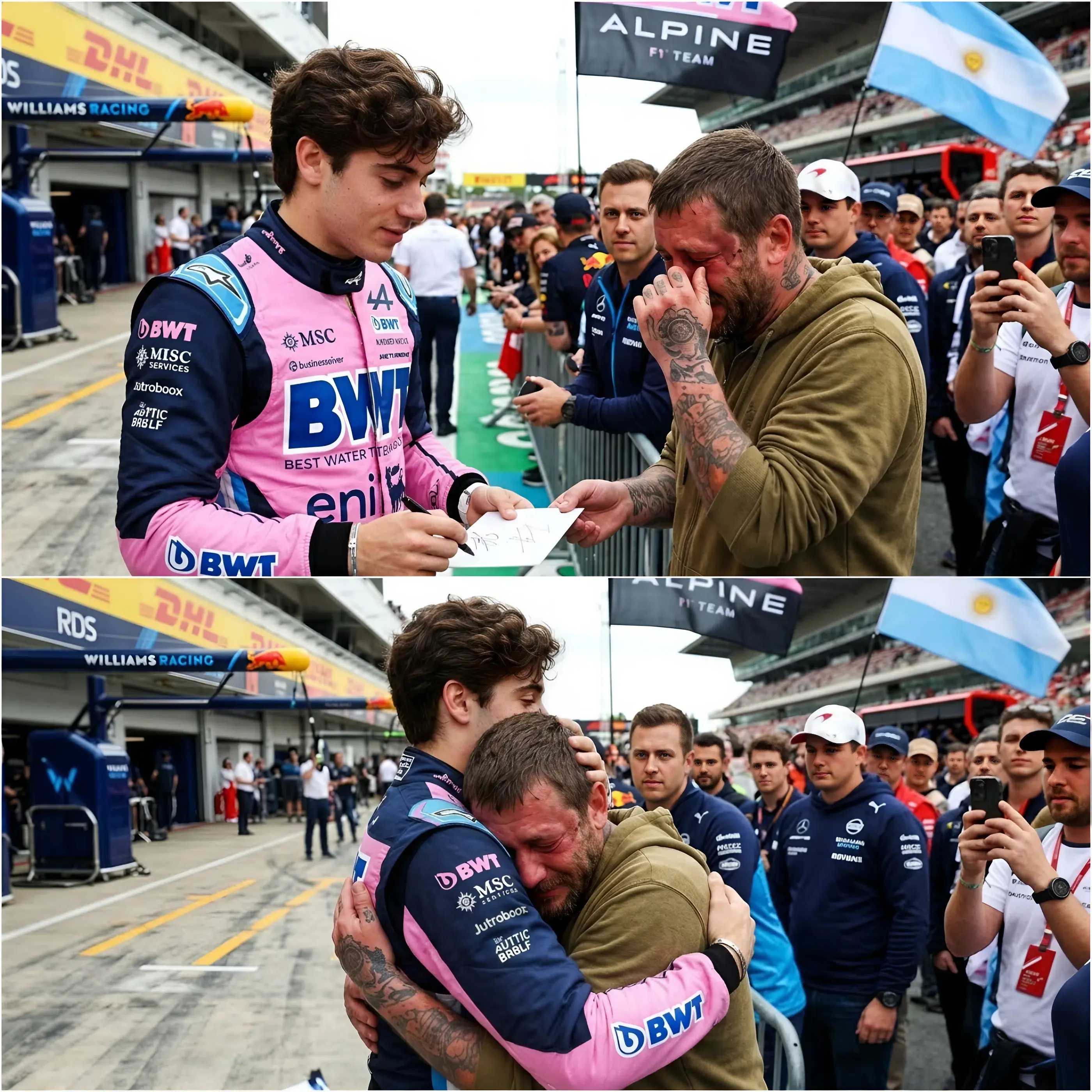 El momento ocurrió durante un encuentro con aficionados que inicialmente parecía ser un evento sencillo y rutinario. El joven piloto argentino Franco Colapinto, una de las nuevas caras más prometedoras del automovilismo internacional, estaba saludando a seguidores y firmando autógrafos cuando una escena inesperada captó la atención de todos los presentes. Lo que comenzó como una situación aparentemente tensa terminó convirtiéndose en una historia profundamente emotiva que muchos testigos aseguran que nunca olvidarán.