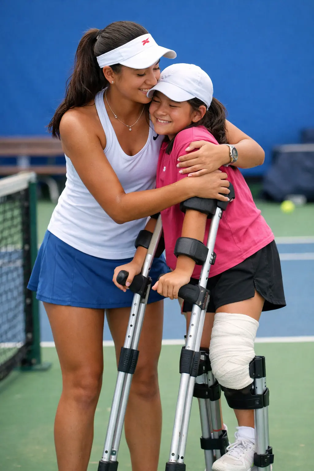 Then something extraordinary happened—an unscripted gesture that would soon dominate sports headlines. From the spectator stands, a small girl, no older than ten, slowly approached the court. Her right leg was heavily bandaged, and she moved carefully forward using a pair of crutches.