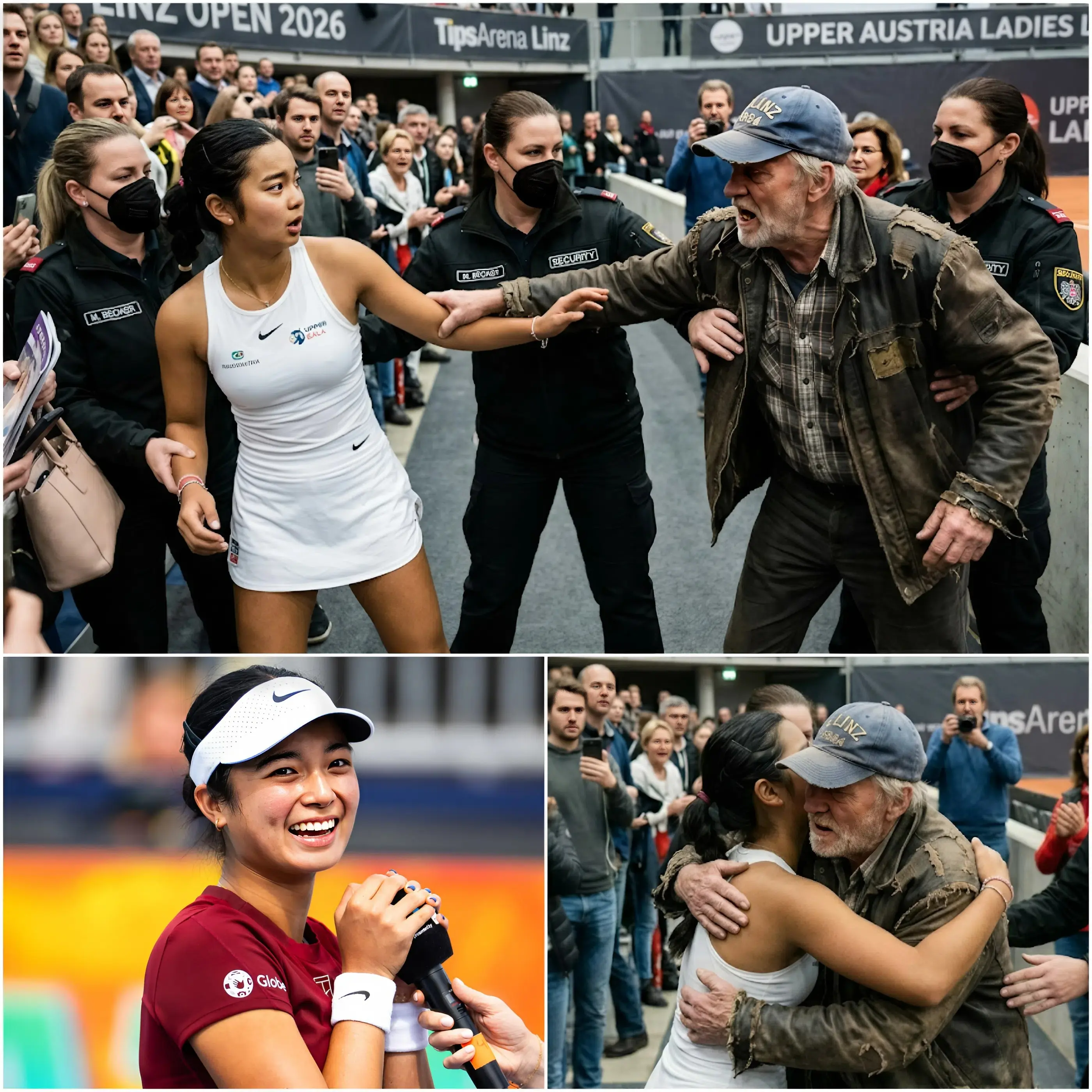 The man’s appearance, humble in dress and age, stood in striking contrast to the energy of the tournament and the youthful athleticism on display. His worn sneakers, faded cap, and frayed jacket told the story of decades lived—possibly a lifetime of dedication, struggles, and personal experiences that led him to this precise moment at the Linz Open. In a world obsessed with status, image, and speed, this encounter highlighted the beauty of slowing down to recognize the humanity in one another.