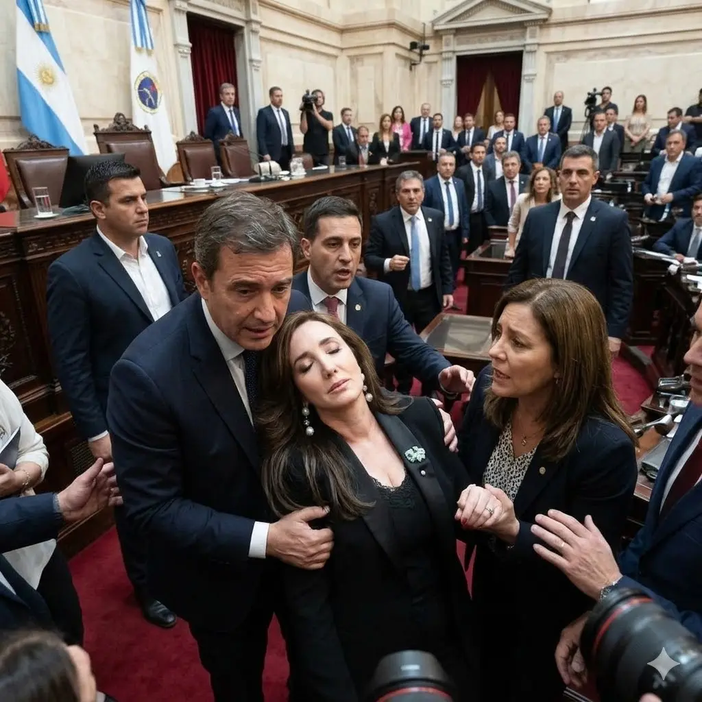 La sala de prensa del gobierno argentino, ubicada en el corazón de la Casa Rosada, se convirtió en cuestión de segundos en un escenario de conmoción absoluta. Hace apenas treinta minutos, durante una reunión tensa convocada para abordar la crisis política que sacude al oficialismo, la vicepresidenta Victoria Villarruel se desplomó repentinamente frente a los ojos atónitos de periodistas, funcionarios, parlamentarios y un grupo de ciudadanos invitados como testigos. El golpe seco contra el piso resonó en el silencio que se hizo inmediatamente después, roto solo por los gritos de auxilio y el correr apresurado de los agentes de seguridad.