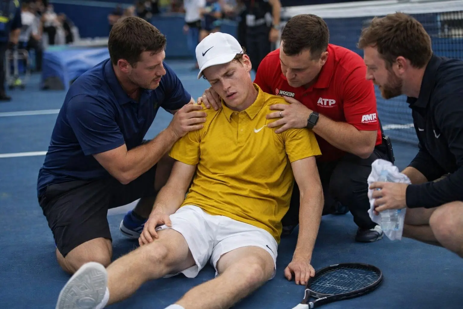 Secondo le prime ricostruzioni, l’episodio si è verificato durante una fase intensa dell’allenamento. Sinner stava disputando uno scambio prolungato quando, improvvisamente, si è fermato, mostrando evidenti segnali di disagio. Dopo pochi istanti, si è accasciato sul campo, costringendo lo staff ad intervenire senza esitazione. L’intera area è stata rapidamente messa in sicurezza, mentre il personale medico accorreva per prestare assistenza.