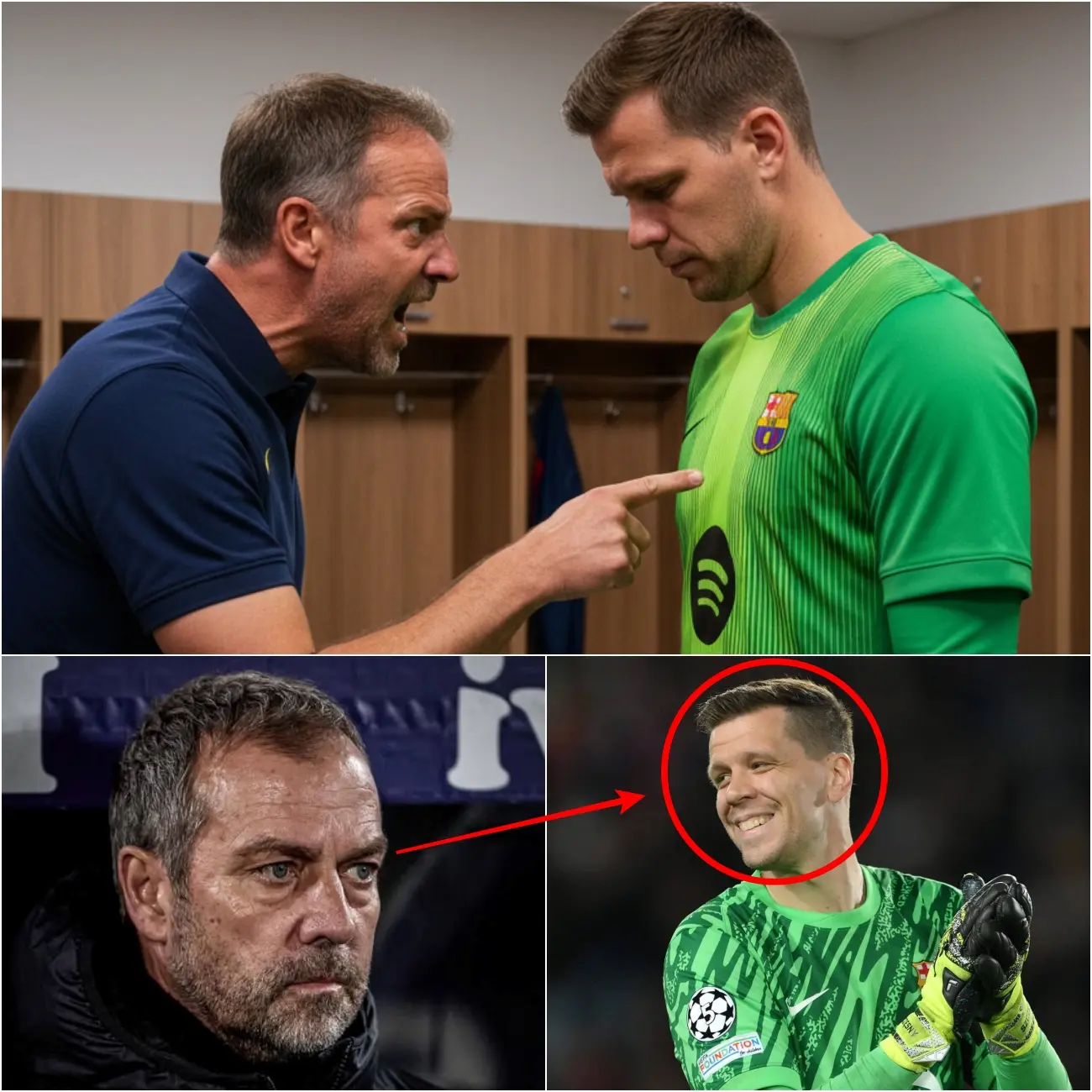 Ce qui devait être une soirée de fête après la victoire du FC Barcelone contre le Celta Vigo (4-2) s’est transformé en véritable tempête interne. D’après plusieurs sources proches du club, Hansi Flick aurait explosé de colère dans le vestiaire, reprochant à plusieurs joueurs – et surtout à Wojciech Szczęsny – leur manque de discipline et de concentration. Un témoin présent dans le couloir aurait entendu l’entraîneur allemand crier : « Ce n’est pas un cirque ici, c’est Barcelone ! »