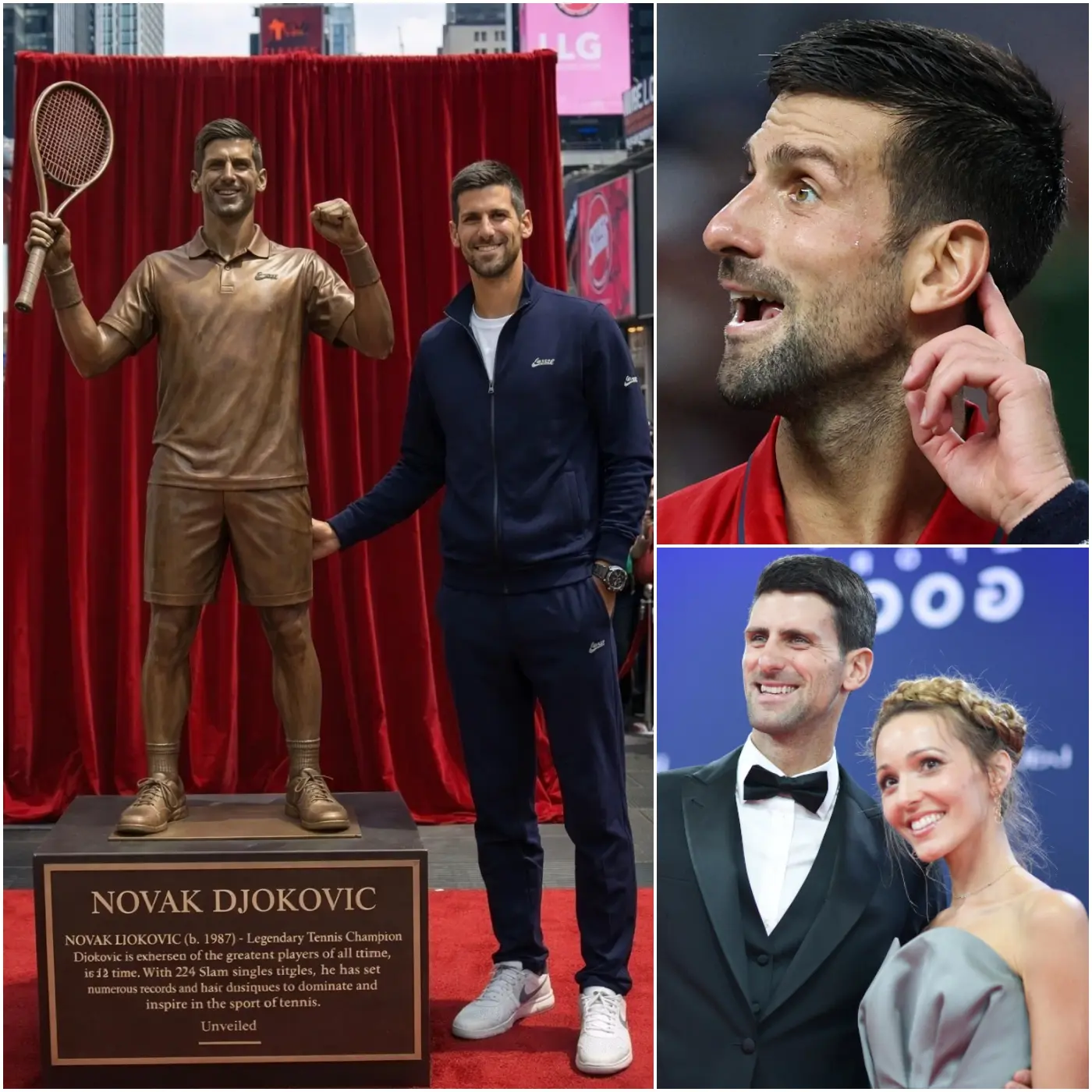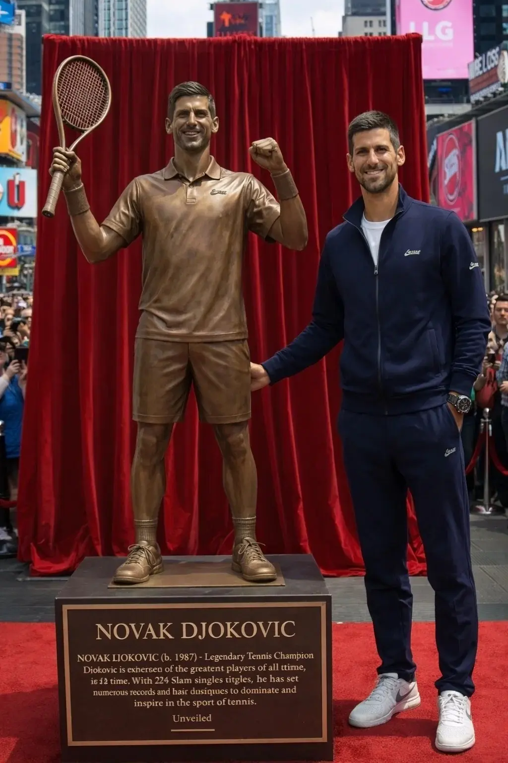 Ce jour-là, l’atmosphère sur Hollywood Boulevard était différente de toutes les autres cérémonies habituelles. Les touristes, les fans de sport et les curieux se sont rassemblés pour assister à la révélation de cette œuvre impressionnante. Lorsque le voile a été retiré, une sculpture grandeur nature de Novak Djokovic est apparue, raquette à la main, le bras légèrement levé dans une posture de victoire calme et confiante. Beaucoup de spectateurs ont immédiatement sorti leurs téléphones pour capturer ce moment historique, tandis que d’autres restaient silencieux, impressionnés par la puissance symbolique de la statue.