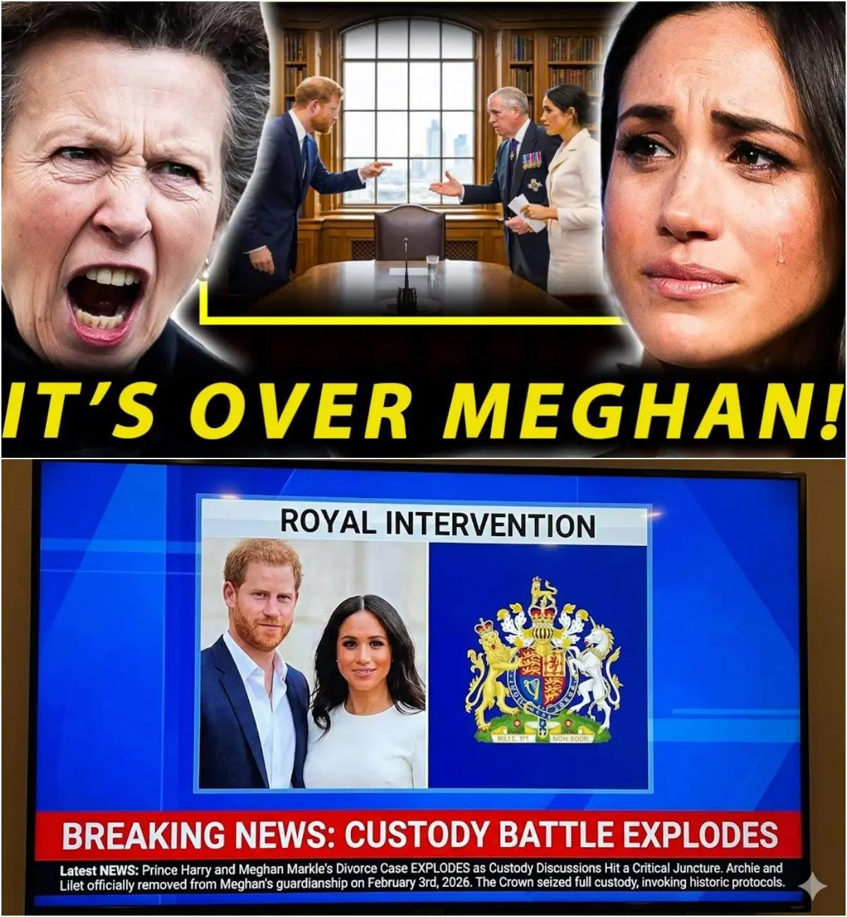 The sensational headline circulating widely—”Latest NEWS: Prince Harry and Meghan Markle’s Divorce Case EXPLODES as Custody Discussions Hit a Critical Juncture”—along with claims of a “devastating custody defeat” for Meghan Markle on February 3, 2026, where Archie and Lilibet were “officially removed from Meghan’s guardianship” and “the Crown seized full custody” under historic protocols—has ignited intense speculation across social media, YouTube channels, and tabloid-style outlets.