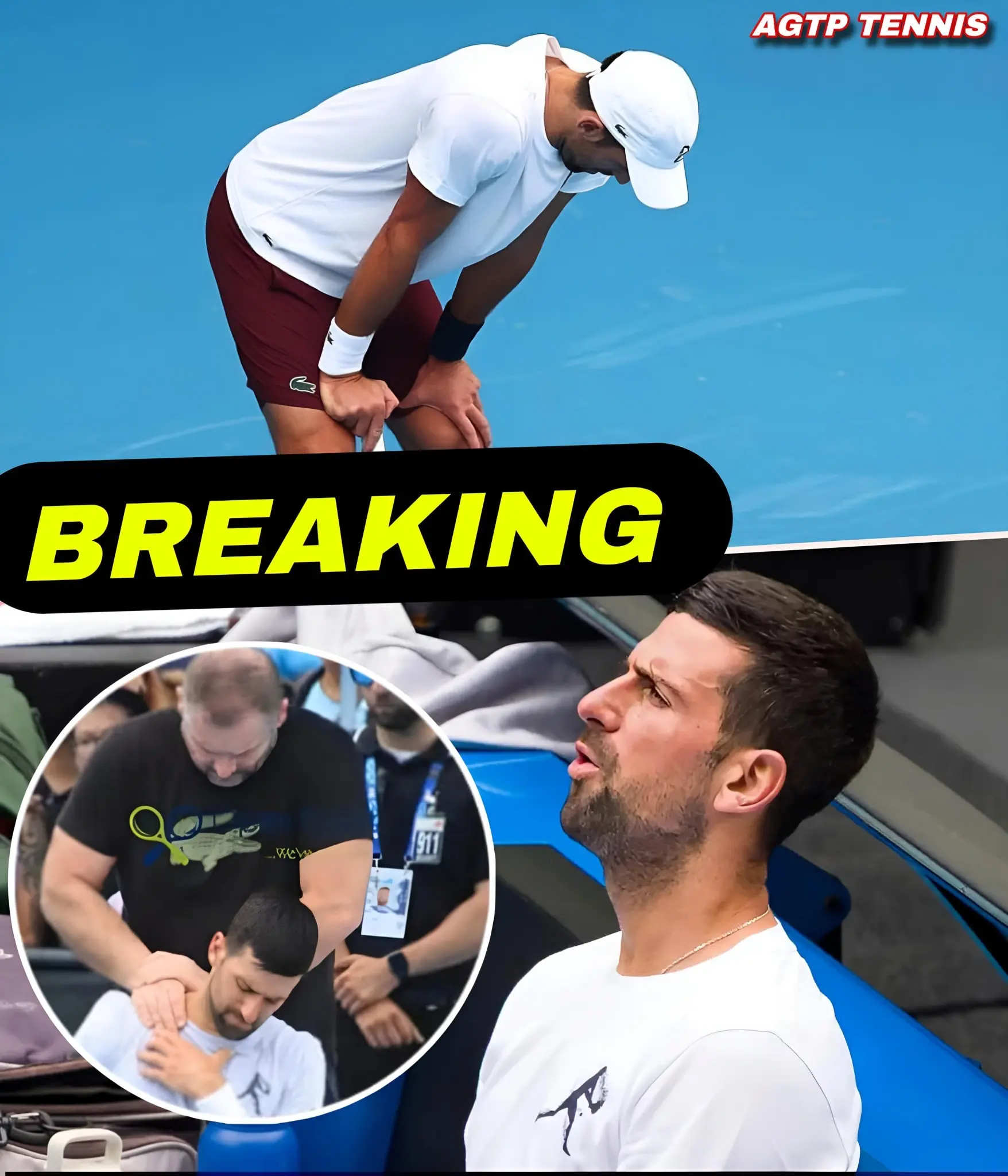 Según el relato viral, todo ocurrió tras un partido especialmente exigente. Djokovic apareció ante los medios con el rostro tenso, visiblemente afectado, mientras su equipo técnico le aplicaba un tratamiento intenso en el cuello. Las cámaras captaron un momento de silencio incómodo, que fue interpretado como el preludio de una confesión devastadora que nadie esperaba escuchar de una leyenda viva del deporte.