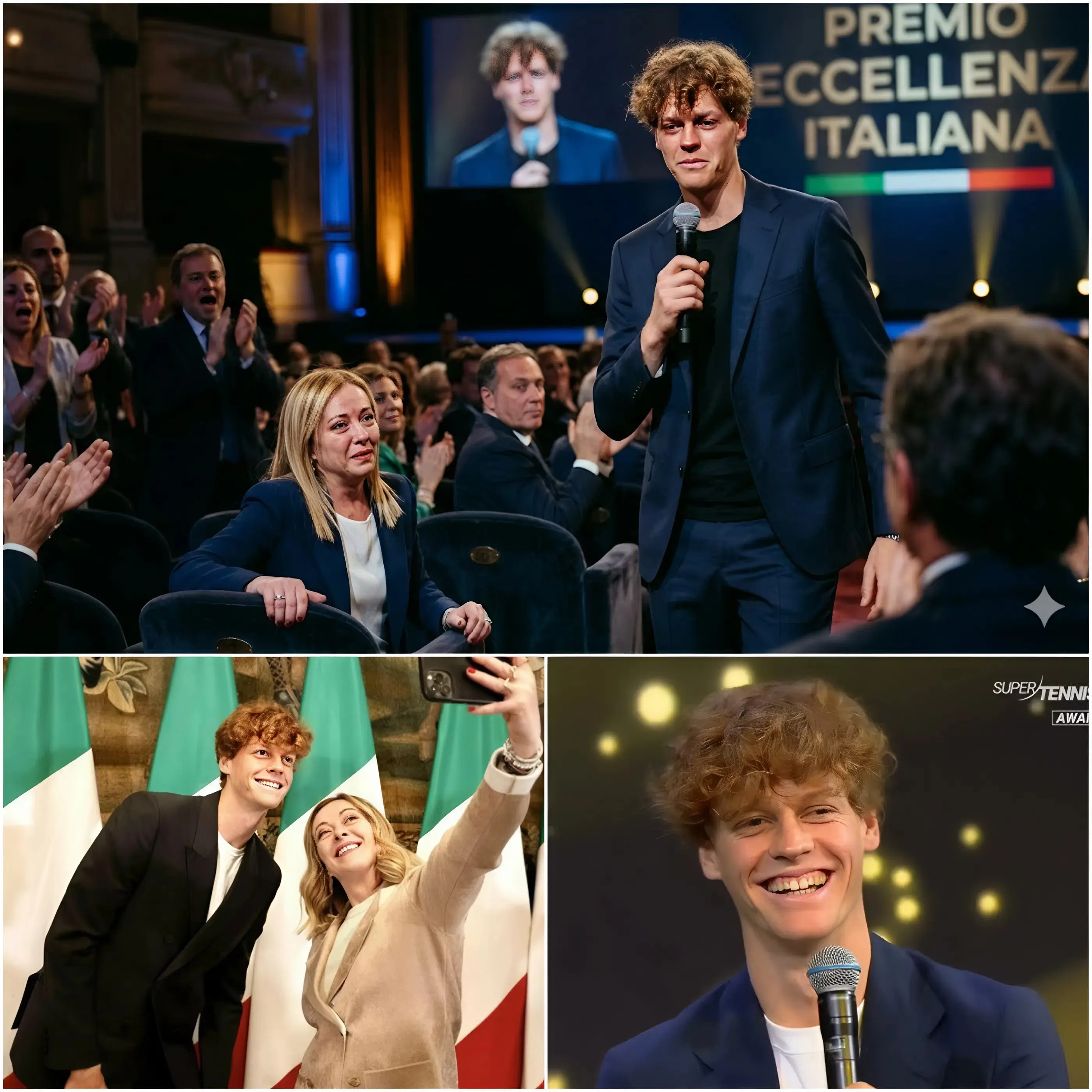 La serata che doveva essere una semplice celebrazione sportiva si è trasformata in uno dei momenti più emozionanti della storia recente del tennis italiano. Quando Jannik Sinner salì sul palco, nessuno immaginava che le sue parole avrebbero scosso l’intero auditorium e commosso perfino il Primo Ministro Giorgia Meloni.