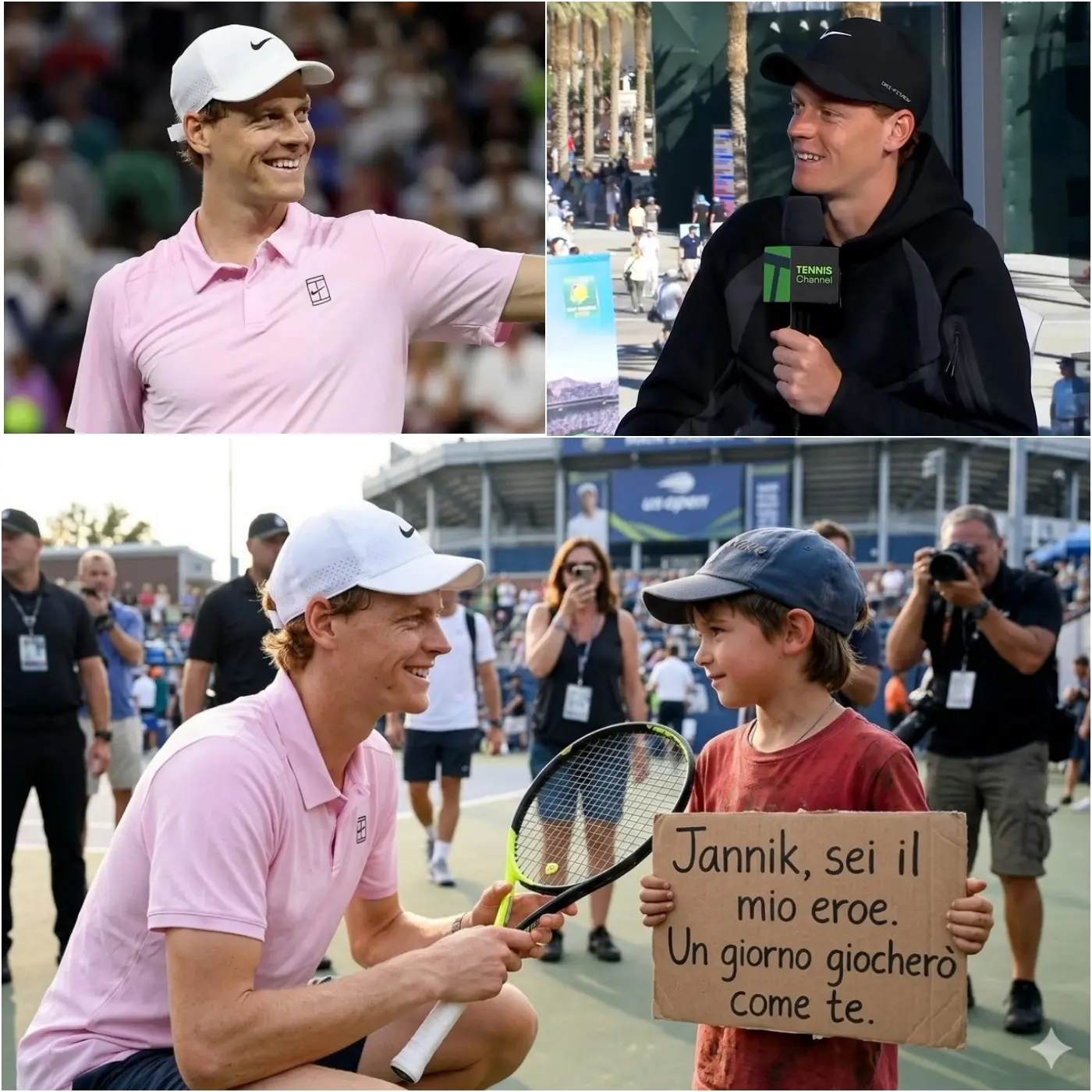 La folla si è zittita all’istante. Le guardie del corpo si sono irrigidite, ma nessuno ha osato fermarlo. Jannik si è fermato a un metro dal ragazzo, si è chinato leggermente per guardarlo negli occhi e ha sorriso – quel sorriso timido e sincero che i fan conoscono bene.