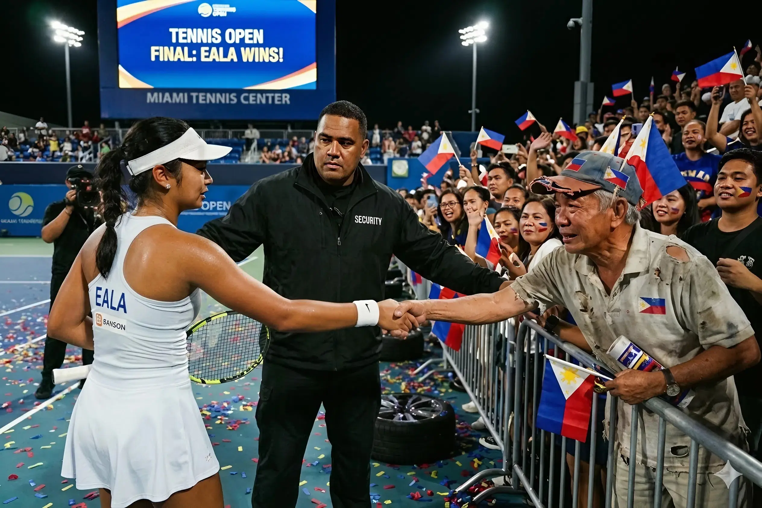 🚨 Security was about to step in, but Alexandra Eala calmly raised his hand and said, “Let him come closer.” A man in his sixties, wearing simple clothes and carrying a worn bag, was struggling to push through the crowd as Eala greeted fans after his match at the Miami Open 2026. Staff quickly intervened, fearing it could be a risky situation or an overly emotional fan.
