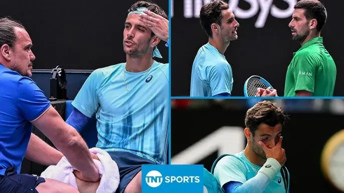 🚨 TENNIS SHOCKWAVE: With just one step away from the semi-finals, Lorenzo Musetti unexpectedly led Novak Djokovic by two sets before abruptly withdrawing due to injury. This decision opened the door for Djokovic to advance, while the stands and social media immediately erupted in speculation. “Luck is on Djokovic’s side again, in an unbelievable way,” many fans angrily commented. Musetti left the court in tears, choked with emotion, saying, “It feels like I’m under a curse.” International media quickly fueled the controversy. In response to the wave of criticism, Djokovic remained calm: “I just focused on playing and respected my opponent.” However, things became even more tense when a leaked video from the locker room went viral, revealing a heated argument between the two players, leading the public to believe the drama was even bigger than what happened on the court. 👇👇