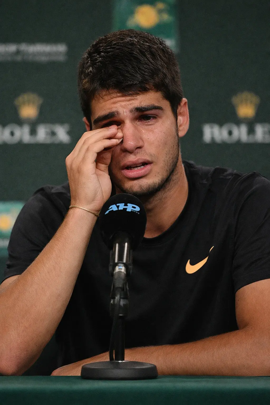 Horas después, en la rueda de prensa posterior al partido, Alcaraz apareció ante los periodistas con los ojos enrojecidos. Su voz temblaba ligeramente mientras intentaba explicar lo que había sentido en la pista. Fue entonces cuando pronunció unas palabras que rápidamente comenzaron a recorrer el mundo del deporte.
