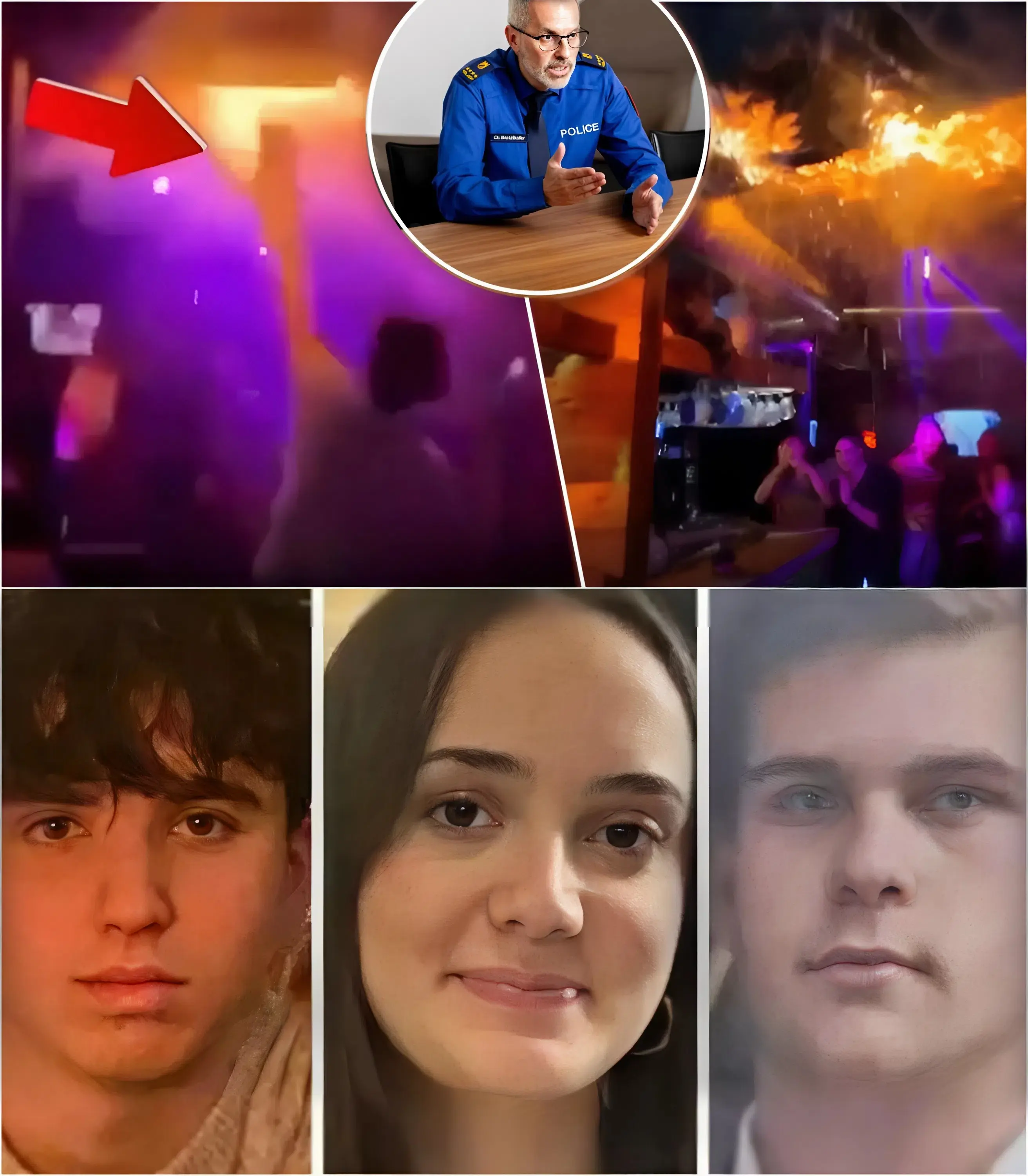 Het detail dat de onderzoekers “sprakeloos” achterliet, zoals de commandant van de kantonnale politie het noemde, is dit: op 38 seconden in de video draait een jongeman van ongeveer 22 jaar, met een glas in zijn hand, zich naar de camera, lacht breeduit en steekt expliciet zijn duim omhoog, alsof hij wil zeggen: “Alles is in orde.” Op datzelfde moment verschijnen de eerste zichtbare vlammen achter hem, op minder dan drie meter afstand. Tien seconden later begint hij te hoesten, kijkt verward om zich heen… en verdwijnt in de zwarte rook op 52 seconden.